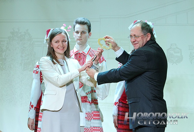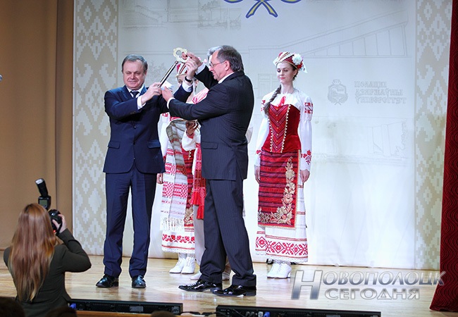 Местом проведения церемонии передачи корпусов был выбран актовый зал, где и собрались участники мероприятия. Три года назад здесь проходил белорусско-латвийский форум, а сегодня в его стенах бурлит творческая жизнь студентов. В присутствии многочисленных гостей генеральный директор ОАО «Нафтан» Владимир Третьяков вручил символический ключ от учебных корпусов ректору ПГУ Дмитрию Лазовскому.