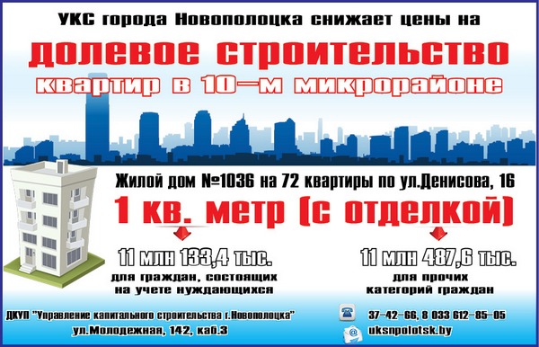 uksnpolotsk.by. «Ваши деньги будут находиться под гарантией и контролем государства и, соответственно, защищены от каких-либо форс-мажорных обстоятельств, – подчеркивает директор «Управления капитального строительства г.Новополоцка» Александр Мулярёнок. – Качество выполняемых нами строительно-монтажных работ проверено временем. Нам доверяют люди, и мы стараемся их не подвести. Сегодня УКС – лидер на рынке долевого строительства Новополоцка. Добро пожаловать в число наших клиентов!»