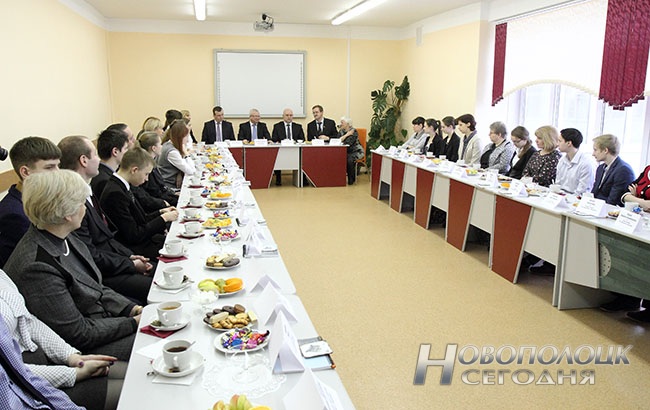 В конференц-зале лицея почетные гости из Витебска и руководство города во главе с председателем Новополоцкого горисполкома Дмитрием Демидовым встретились с директорами, учителями и учащимися – победителями третьего (областного) этапа предметных олимпиад. В теплой дружеской атмосфере за чашкой чая ребята и педагоги смогли поделиться успехами и достижениями, задали волнующие вопросы представителям власти.