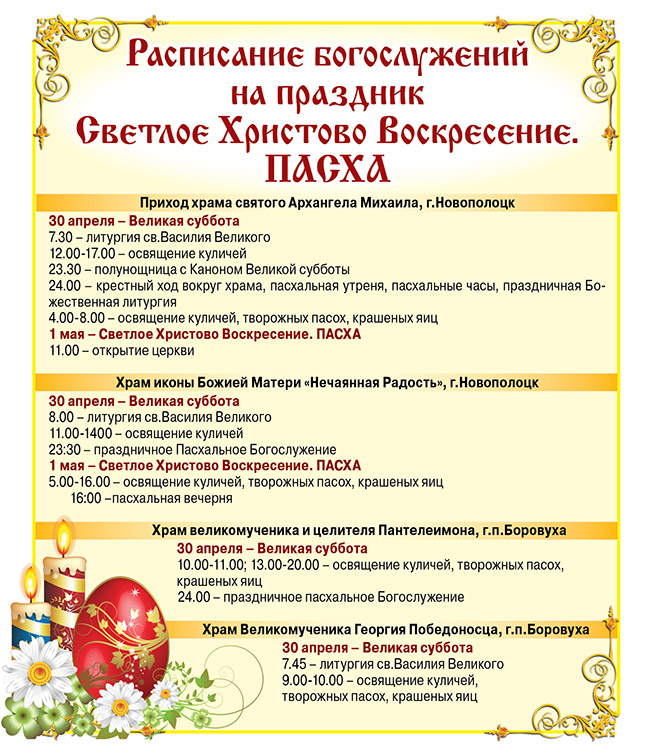 Расписание богослужений на ПАСХУ в храмах Новополоцка и Боровухи