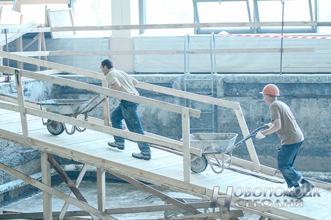 Демонтаж чаши бассейна, потребовавший снятия облицовочной плитки и подстилающих слоев на площади 1800 квадратных метров, по факту оказался намного больше оценочного объема. Чтобы не допустить отклонения от графика, на этом этапе восстановления объекта подразделениям ОАО «Нефтезаводмонтаж» пришлось работать в две смены. При последующем бетонировании чаши на армирование днища ушло 11,5 тонны металлической арматуры. На сегодняшний день сделано около 80 процентов того, что планировалось. О завершающей фазе реконструкции рассказывает главный инженер спорткомплекса Юрий Мелешко: