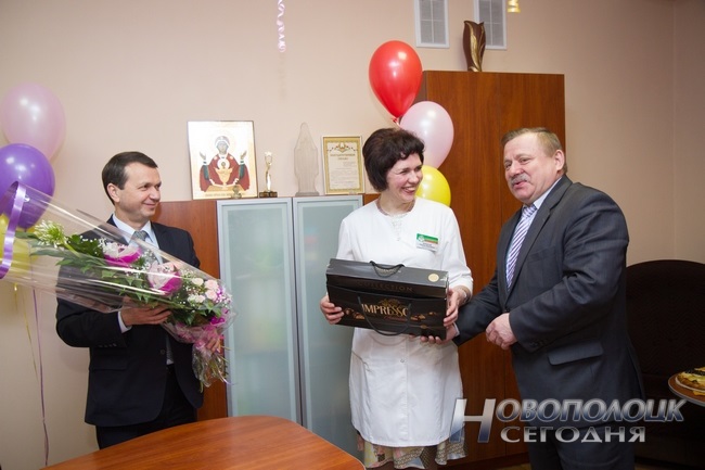 Мозаика жизнеописания была бы неполной без личного праздника. В минувшую пятницу Наталья Николаевна принимала многочисленные поздравления от коллег, друзей и близких по случаю 45-летия. Одни из первых здравиц в честь именинницы прозвучали от администрации УЗ «НЦГБ» (на снимке).
