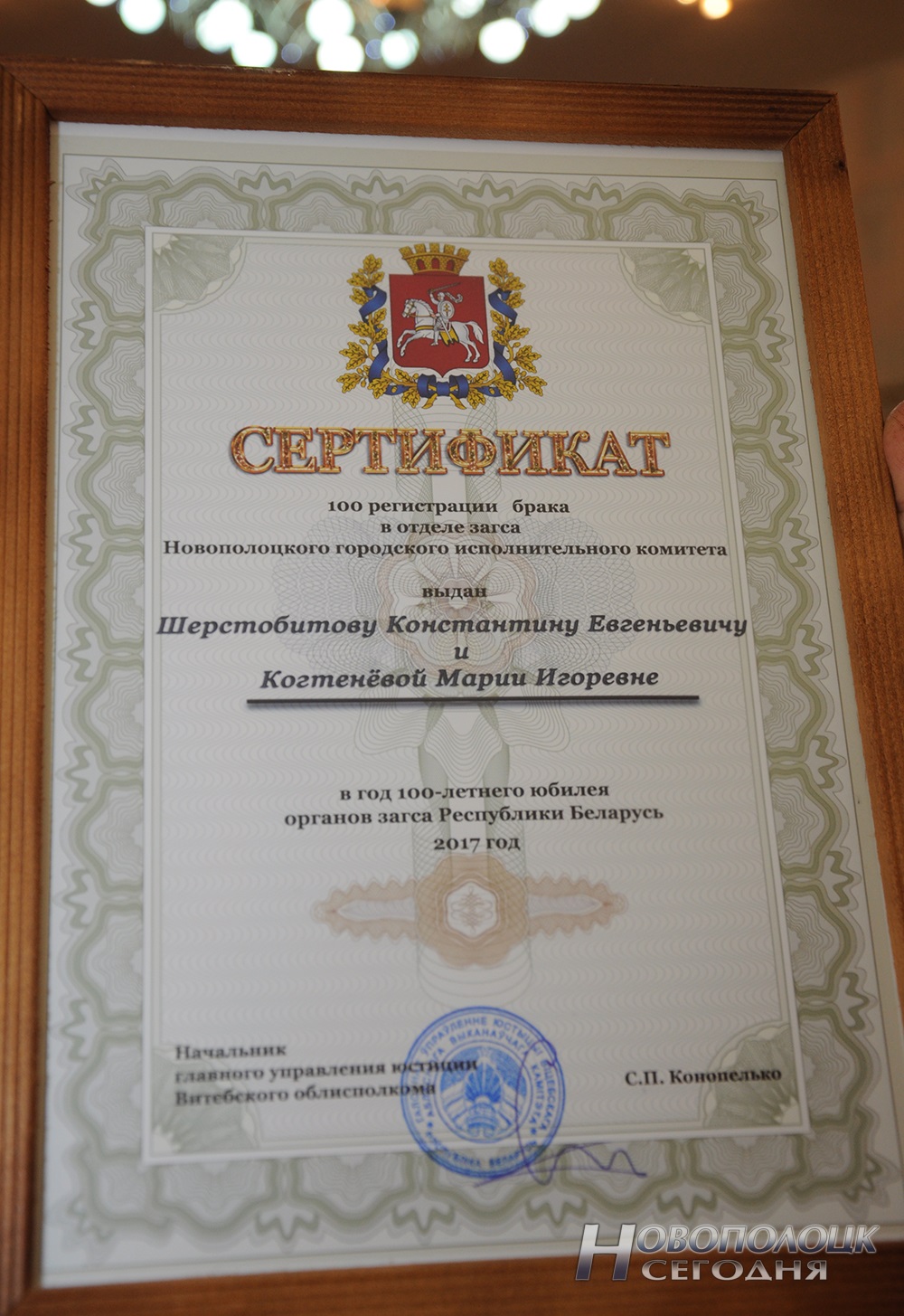 В подтверждение этих слов начальник отдела ЗАГС Новополоцкого горисполкома Илона Криштопенко вручила главе новоиспеченной семьи памятный сертификат, подписанный начальником главного управления юстиции Витебского облисполкома Сергеем Конопелько.