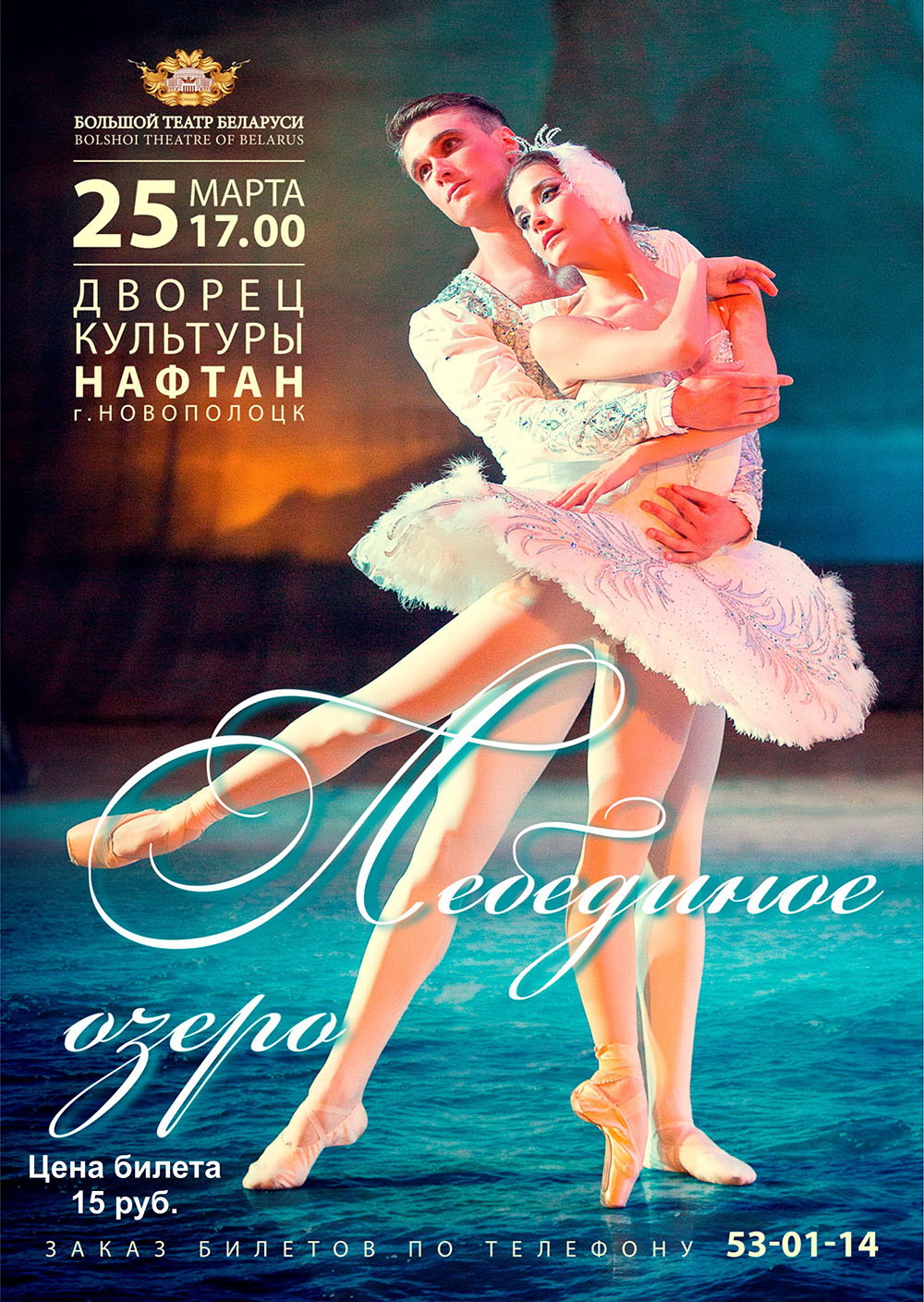 25 марта на сцене Дворца культуры ОАО «Нафтан» вновь заблистают лучшие артисты Национального академического большого театра оперы и балета Республики Беларусь. Столичные гости порадуют новополоцкую публику шедевром мировой хореографии «Лебединое озеро».