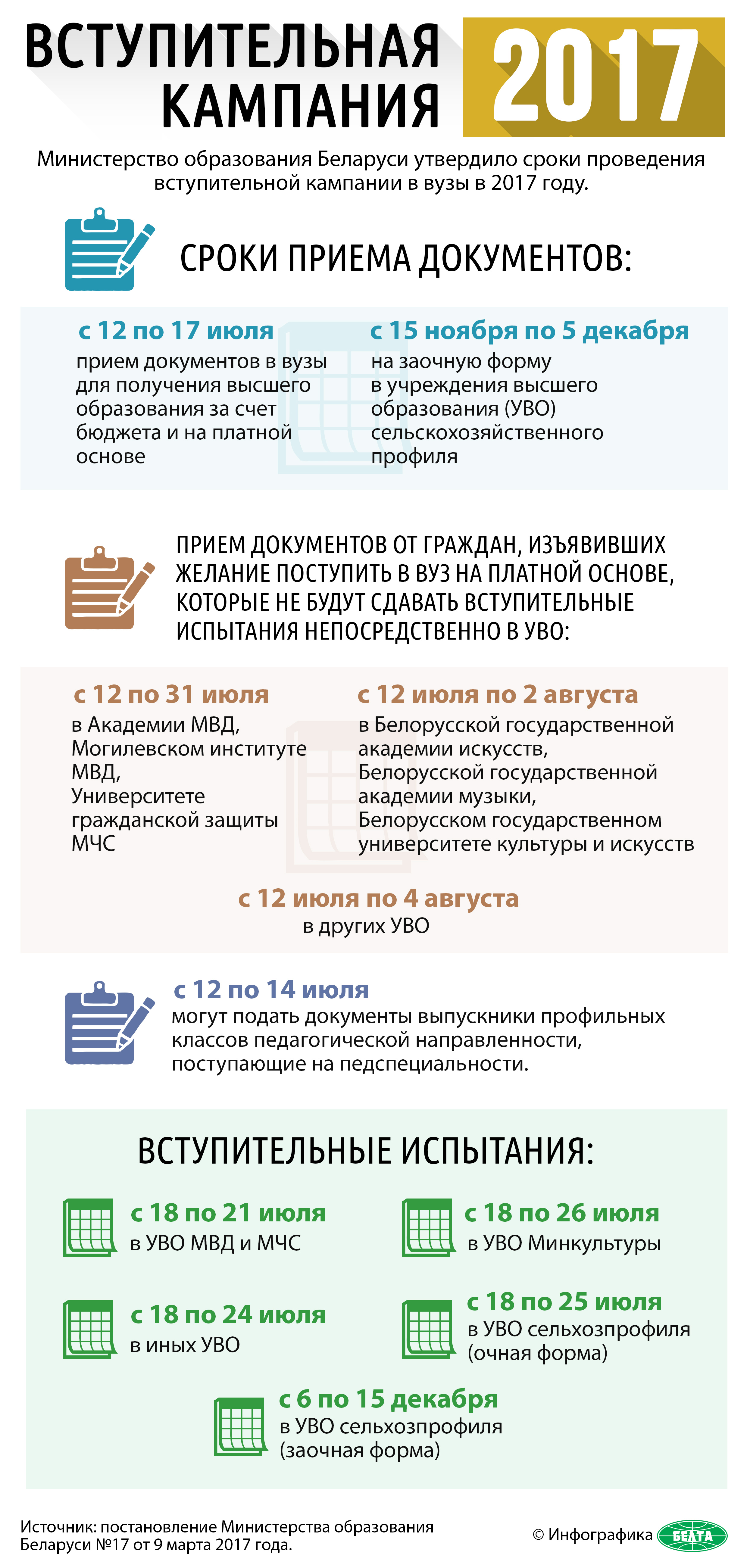 Министерство образования Беларуси утвердило сроки проведения вступительной кампании в вузы в 2017 году. Сроки приема документов: