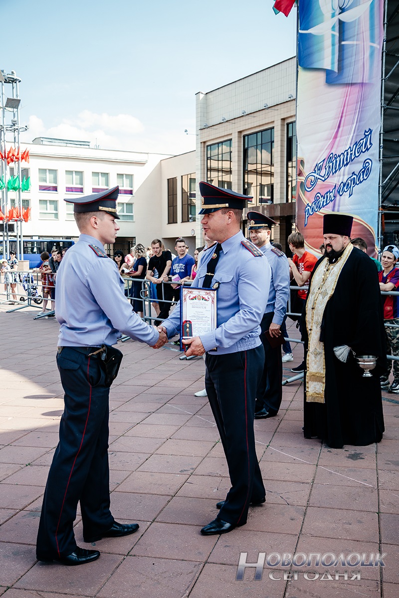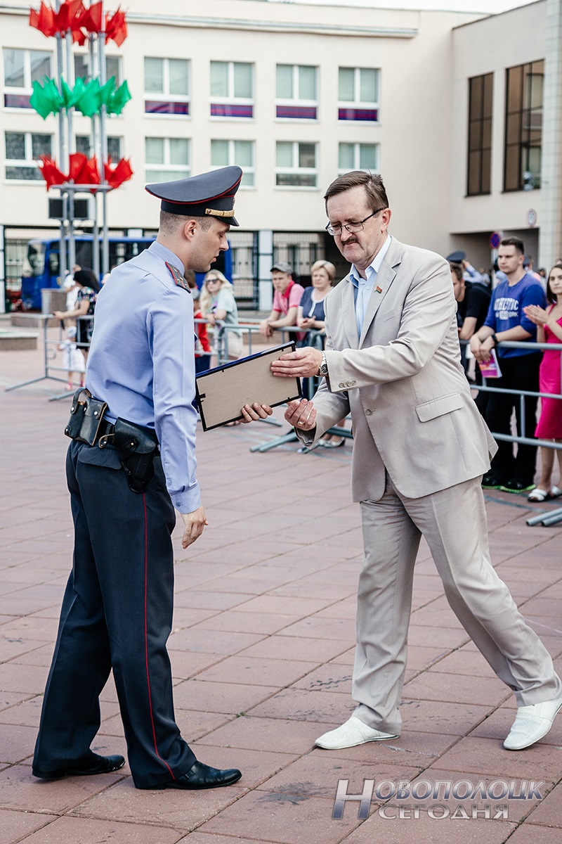 Обращаясь к личному составу гарнизона, председатель городского Совета депутатов Олег Буевич подчеркнул: «Мы гордимся своей милицией – и это не просто слова. Те показатели, которые имеет Новополоцкий ГОВД, лучшие не только в Витебской области, но и в Республике Беларусь. Поэтому от имени жителей города огромная вам благодарность за вашу службу».