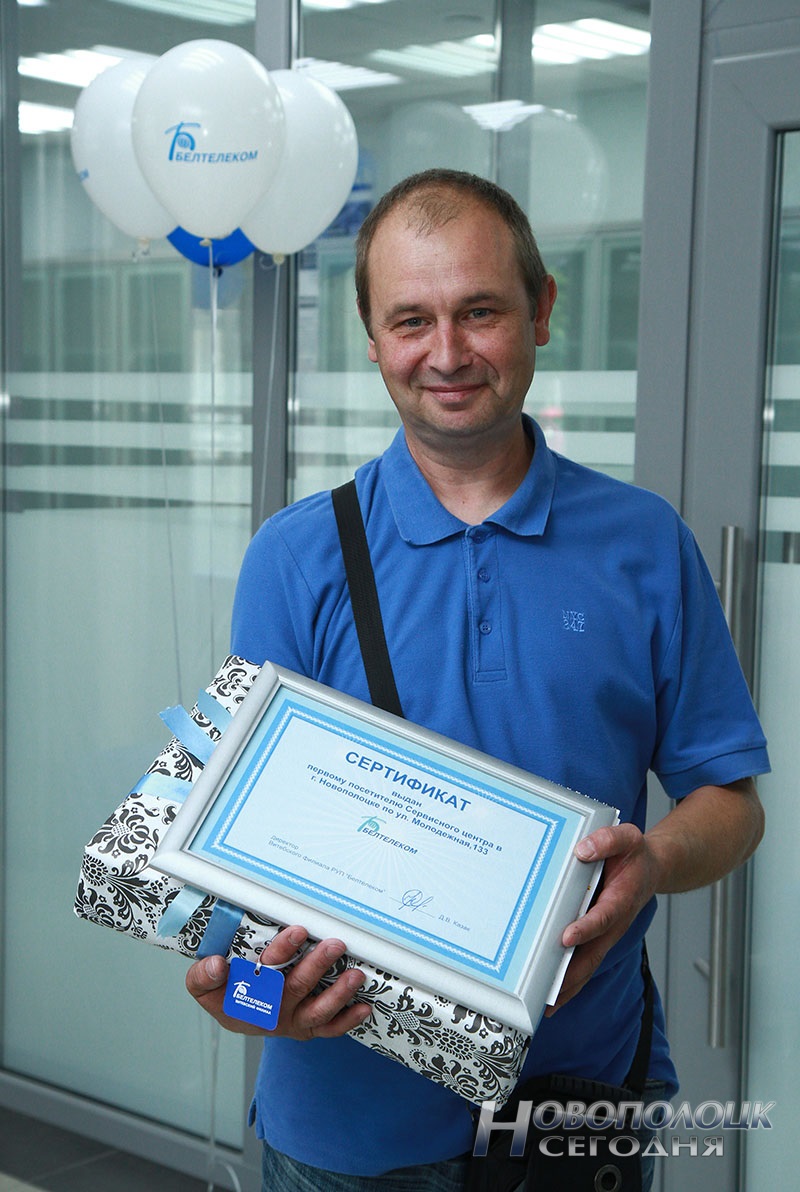 Не обошлось в день открытия сервисного центра и без сюрпризов. Сертификат и памятный подарок от компании «Белтелеком» получил первый клиент, заключивший договор на пакет услуг «Ясна». Им оказался Александр Алексеев.