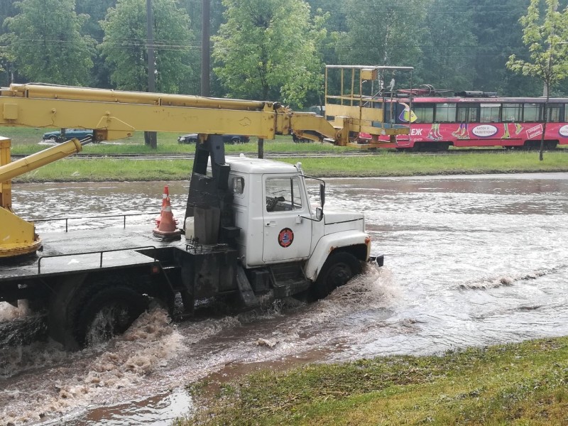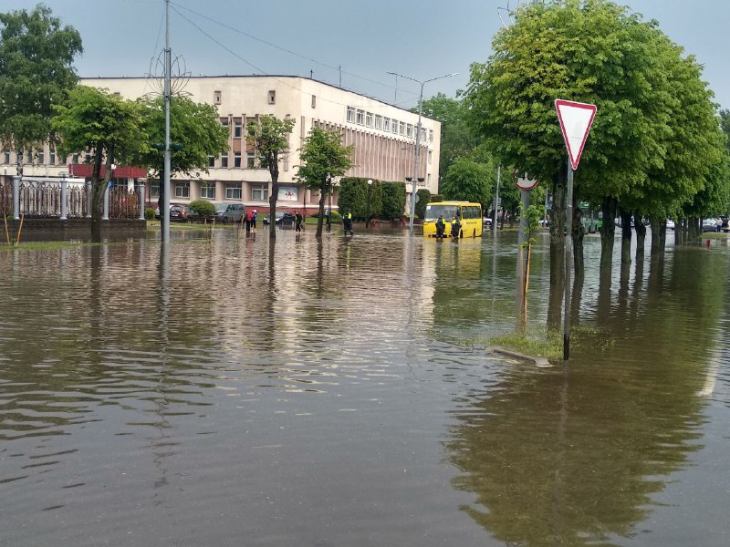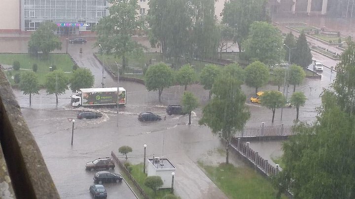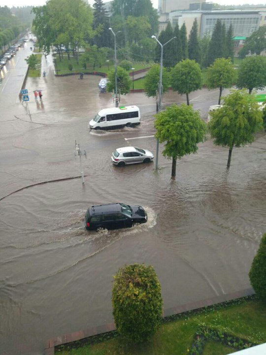 Новополоцк сегодня затопило дождем. В обеденное время в городе разыгралась непогода. Внезапный ливень оказался настолько сильным, что в считанные минуты дороги заполнились водой. В центре города и на объездной дороге лужи разлились выше бордюров, машины, автобусы и трамваи останавливались, не справляясь с движением в потоке воды.