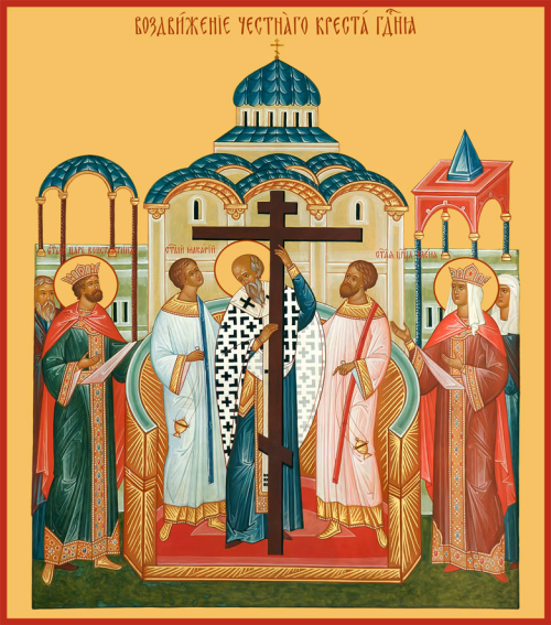 Точная дата обретения Честного Креста неизвестна. Согласно историческим источникам это произошло в 325 или 326 году. В те времена император Константин Великий решил найти утраченную святыню – Крест Христов. Вместе со своей матерью, царицей Еленой, он отправился в поход на Святую Землю. Было принято решение провести раскопки рядом с горой Голгофой, так как у иудеев существовал обычай закапывать орудия казни рядом с местом ее совершения. И, действительно, в земле нашли три креста, гвозди и доску, которая была прибита над головой распятого Спасителя. Как говорит Предание, к одному из крестов прикоснулся больной человек и получил исцеление. Таким образом, император Константин и царица Елена смогли определить Животворящий Крест Господень. А для того, чтобы собравшийся народ смог его увидеть Патриарх Иерусалимский Макарий встал на возвышение и стал поднимать («воздвигать») Крест. Все собравшиеся с молитвой кланялись обретённой святыне. С этого времени император Константин начал строительство целого ряда храмов в Палестине, на местах, связанных с событиями земной жизни Господа Иисуса Христа.
