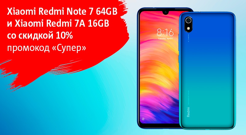 В сети салонов и интернет-магазине МТС смартфоны Xiaomi Redmi 7A 2/16 Гб и Xiaomi Redmi Note 7 4/64 Гб можно приобрести дешевле на 10%. Скидка действует по промокоду «Супер» и распространяется только на покупку единым платежом.