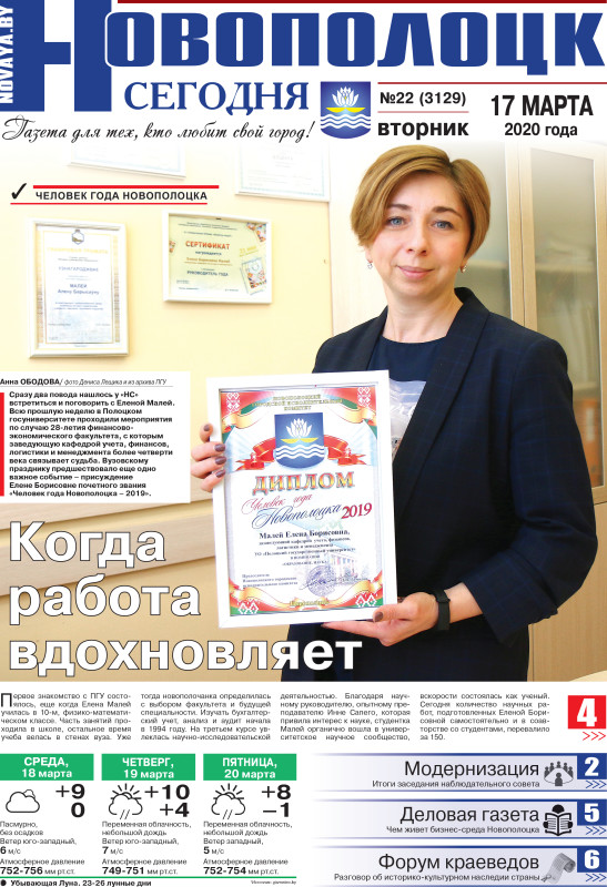 Когда работа вдохновляет Сразу два повода нашлось у «НС» встретиться и поговорить с Еленой Малей. Всю прошлую неделю в Полоцком госуниверситете проходили мероприятия по случаю 28-летия финансово-экономического факультета, с которым заведующую кафедрой учета, финансов, логистики и менеджмента более четверти века связывает судьба. Вузовскому празднику предшествовало еще одно важное событие – присуждение Елене Борисовне почетного звания «Человек года Новополоцка – 2019».