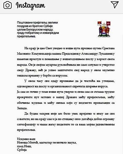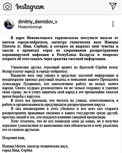 Сербский город-побратим Новополоцка разделяет официальную позицию белорусских властей по сдерживанию распространения коронавирусной инфекции и связанных с этим волнений. Открытое письмо по этому поводу поступило в адрес Новополоцкого горисполкома, о чем сообщает в своем официальном аккаунте в Instagram глава города, член Совета Республики Дмитрий Демидов.