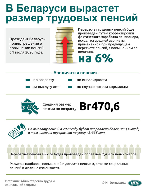 20 июня 2020г. Президентом Республики Беларусь подписан Указ No 232 «О повышении пенсий». Настоящим Указом предусмотрен перерасчет с 1 июля всех трудовых пенсий: по возрасту, за выслугу лет, по инвалидности, по случаю потери кормильца.