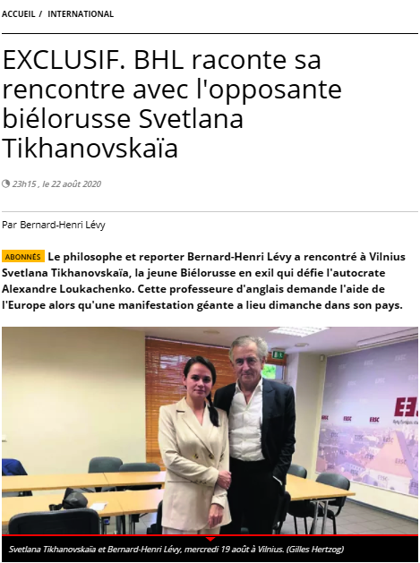 Тихановская ожидает от Запада поддержки, а Бернар-Анри Леви призывает мир сделать для нее цепочку солидарности. В Le Journal du Dimanche вышел материал Леви, подготовленный по итогам его встречи со Светланой Тихановской в Вильнюсе.