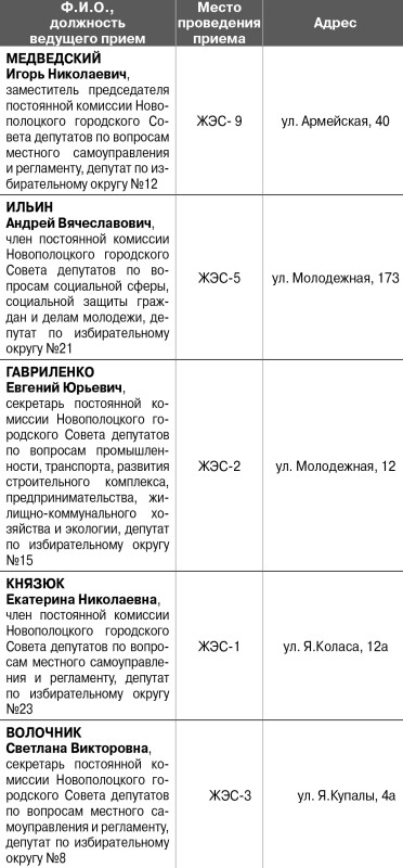 Но и мнение граждан, не являющихся юристами, тоже важно в обсуждении изменений в Основной Закон. Поэтому члены комиссии проведут приемы новополочан по месту жительства – в ЖЭСах (см. график) и в городской общественной приемной (график будет опубликован в ближайшем номере «НС»). Также предложения можно передавать членам комиссии по телефону, через службу «Одно окно», непосредственно в городской Совет депутатов на бумажных носителях или через электронную почту, через средства массовой информации.