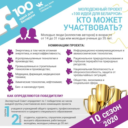 Нынешний сезон конкурса – юбилейный: в этом году он пройдет уже в десятый раз. Принять участие в нем могут молодые люди в возрасте от 14 до 31 года, которые занимаются рационализаторством, разработкой научно-технических и инновационных проектов, представляющих практический интерес для реального сектор экономики. Для молодых ученых этот возрастной порог составляет 35 лет. Представить свои предложения можно в десяти номинациях. В каждой будут определены по два победителя в двух возрастных группах: учащиеся учреждений общего среднего, профессионально-технического и среднего специального образования и студенты, курсанты, слушатели учреждений высшего образования, работающая молодежь, молодые ученые.