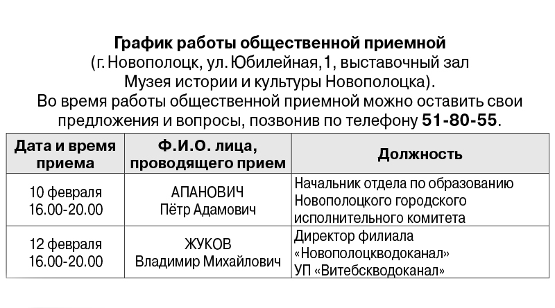 Обратиться к специалисту можно лично либо позвонив по указанному номеру телефона. Приемы проводят представители Новополоцкого горисполкома, депутаты городского Совета, лидеры общественных формирований. Полученная информация обрабатывается, систематизируется и направляется по компетенции.