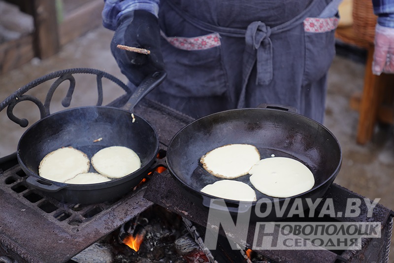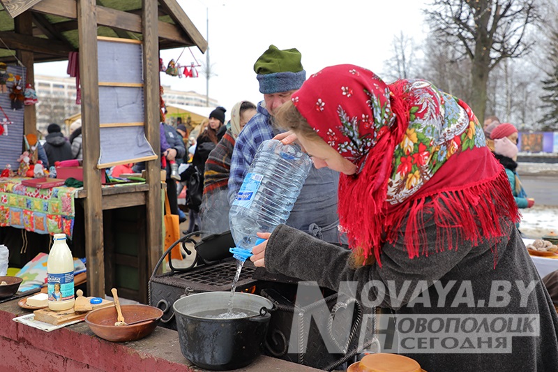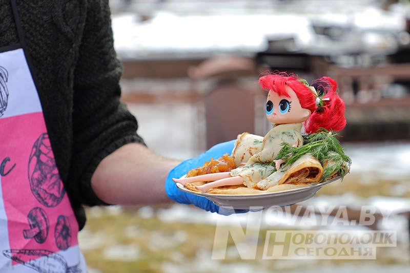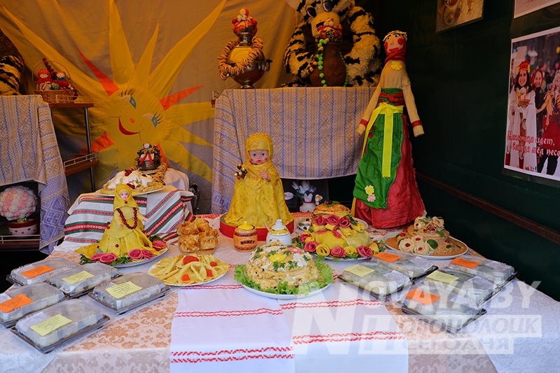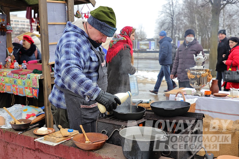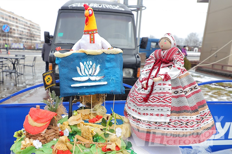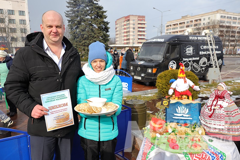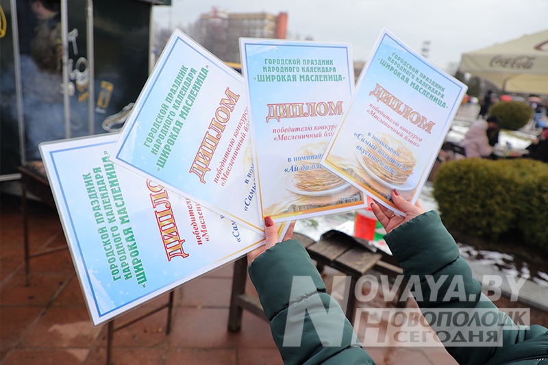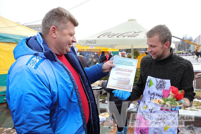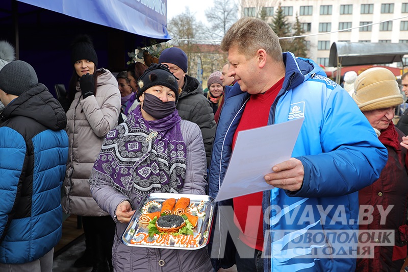 Торговые ряды с угощениями раскинулись по периметру всей площади. Блинов на любой вкус и прочих яств было немалое количество. Тем не менее, у каждой палатки выстраивались длинные очереди. Новополоцкий горисполком даже провел конкурс на лучший масленичный блин. Безоговорочным победителем стала выставка вариативных блинов и кулинарных композиций от гостиничного комплекса «Новополоцк». В номинации «Ай да блин!» выиграла продукция торговой точки сети общественного питания «Нафтан-Сервис». На вкус их продукцию попробовал первый заместитель председателя Новополоцкого горисполкома Сергей Семёнычев, который и вручал дипломы победителям. А вот кулинарные шедевры от спортивного учреждения «Хоккейный клуб «Химик» и ИП Давыдова Н.Б. «Сыты воўк» были настолько хороши внешне, что дегустацию решили не проводить, дабы не нарушать красоту. Необычные, ажурные блины в виде сердец, шаров и даже котиков предлагал фуд-трак от ИП Белихина А.А.