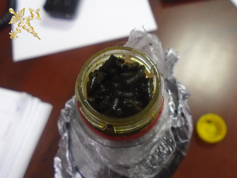 Транспортное средство DAF прибыло в пункт пропуска «Урбаны» для последующего следования на территорию Латвии. В ходе таможенного контроля в личном багаже сотрудниками таможни обнаружены две пластиковые бутылки по 0,5 л, упакованные в пищевую пленку и фольгу, в которых перемещалось в общей сложности 937 грамм гранулированной сыпучей смеси черного цвета с сильным специфическим запахом, характерным для некурительной табачной смеси «насвай».