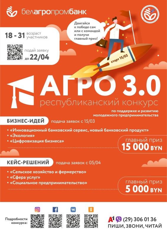 С 15 марта по 30 июня 2021 года Белагропромбанк совместно с Объединенной профсоюзной организацией банка проводят Республиканский образовательный конкурс по поддержке и развитию молодежного предпринимательства «АГРО 3.0».