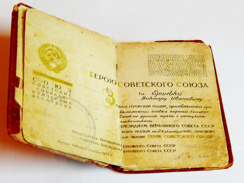 Звездой Героя Советского Союза и орденом Ленина Виктора Еронько наградили в 1944 году. На полях Великой Отечественной наводчик орудия воевал с 1942-го, участвовал в боях на Брянском фронте, в Орловско-Курской битве, освобождал Белоруссию, Польшу, Восточную Пруссию. Осенью 1943-го артиллерист чудом остался в живых – единственный из всего взвода – и почти сутки сражался, подбив шесть танков и в одиночку удержав до подхода своих переправу на реке Сож. Высокого звания заслуживал бы даже один этот подвиг. Но боевые сводки зафиксировали и другие героические эпизоды из жизни солдата. Например, только из донесений, датированных летом 1944-го, узнаем, что 24 июня Виктор Еронько подбил два самоходных орудия и подавил шесть пулеметных точек противника, 30 июня – на шоссе Могилев-Минск подбил три танка, уничтожил шесть автомашин с пехотой, 12 июля – в Гомельской области сокрушил штурмовое орудие, три пулемета и множество вражеских солдат. Он прошел боевой путь от Ржева до Берлина. И даже оставил на стенах Рейхстага свой автограф.