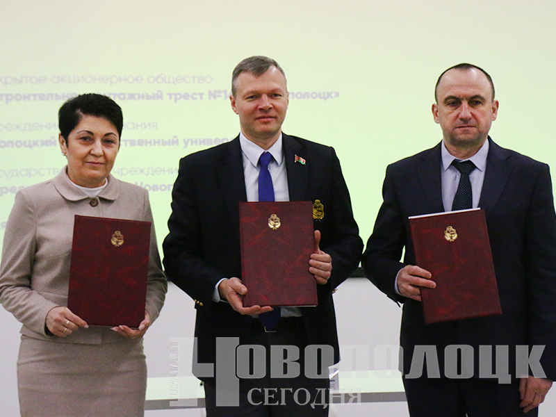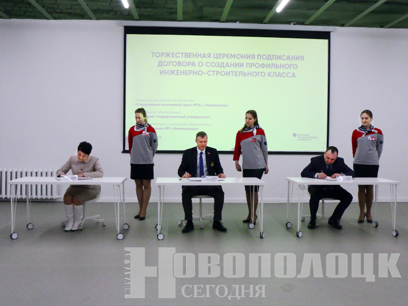 Торжественная церемония подписания трехстороннего договора по профессиональной ориентации учащихся в сфере инженерно-строительной деятельности между Полоцким госуниверситетом, ОАО «Строительно-монтажный трест №16, г. Новополоцк» и средней школой №1 состоялась 13 января. Свои подписи под документом поставили ректор ПГУ Олег Романов, генеральный директор Треста-16 Яков Стародубов, директор СШ №1 Алла Волынец. Это еще один шаг в укреплении сотрудничества. В рамках проекта в следующем учебном году на базе первой школы планируют открыть новое направление обучения учащихся – инженерно-строительное.