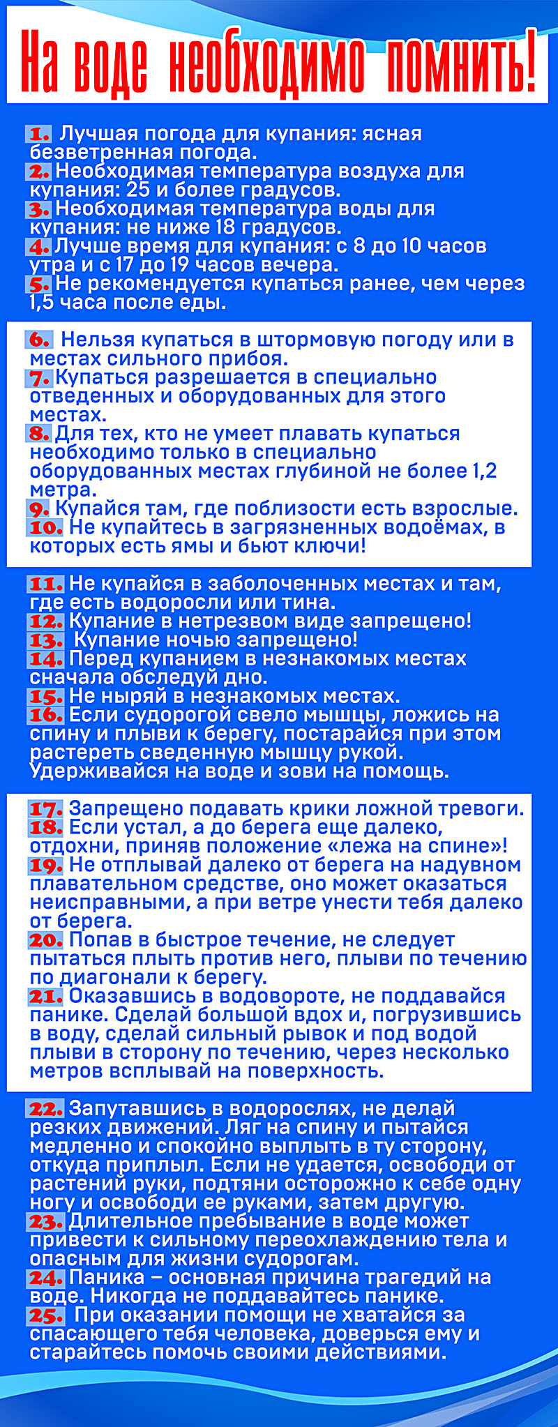 Необходимо строго соблюдать правила поведения на воде для детей летом, знать правила оказания первой помощи на воде себе и окружающим в случае необходимости.