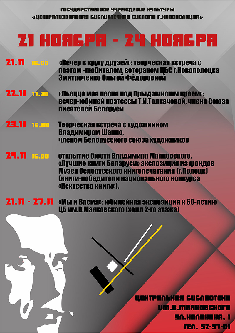 24 ноября в 16.00 состоится торжественное открытие бюста Владимира Маяковского и экспозиции «Лучшие книги Беларуси» из фондов Музея белорусского книгопечатания (г.Полоцк).