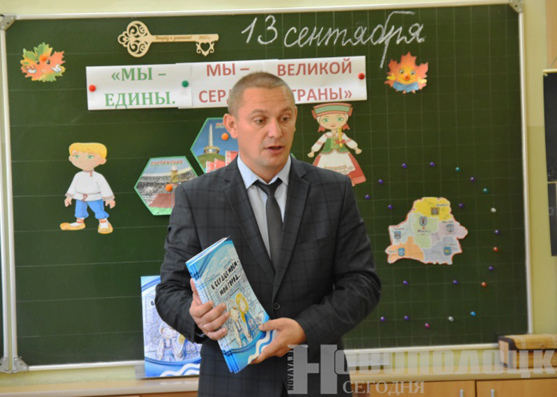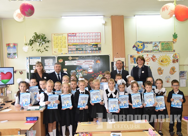В ходе единого урока гости вручили подарки от Новополоцкого горисполкома. Заместитель председателя Сергей Шамрило отметил, что первый класс – очень ответственный период в жизни: «Сегодня вместо того, чтобы гулять в детском саду, спать и бегать, вы сидите за партами и выполняете задания». Он пожелал школьникам усидчивости, любви к родителям и стране. Каждому ребенку Сергей Николаевич подарил книгу о Новополоцке «В сердце моем – мой город»: «В ней вы прочитаете о предприятиях и людях. Возможно, на фотографиях узнаете своих бабушек и дедушек, мам и пап».