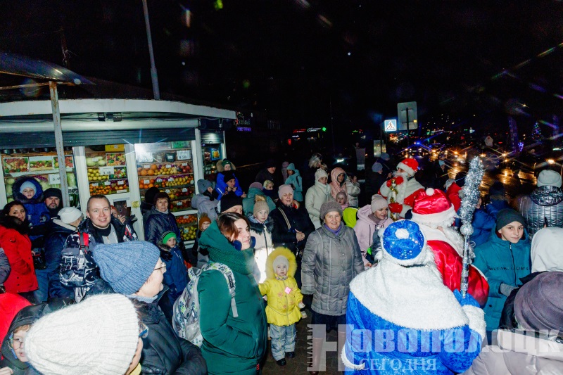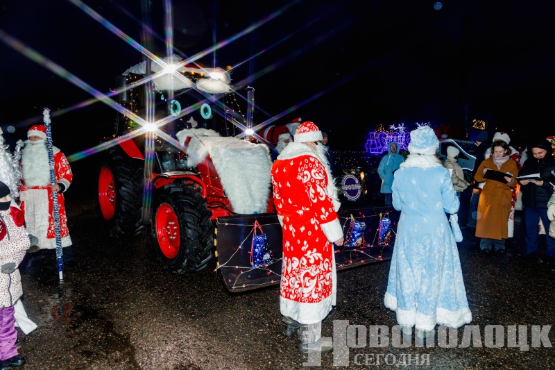 По-новогоднему украшенные авто, танцевальный флешмоб, огненное шоу и многое другое. Как в Новополоцке открыли городскую елку