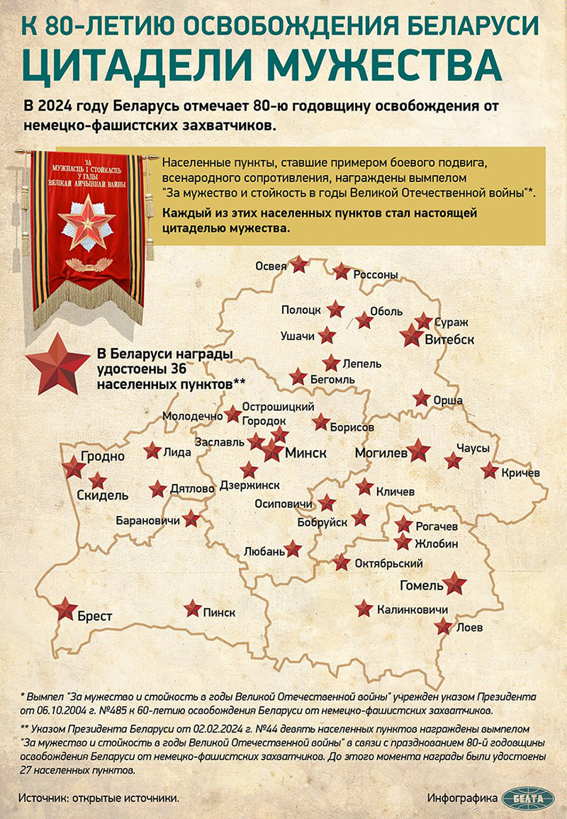 Отдавая дань уважения боевому и трудовому подвигу соотечественников в годы войны, глава государства наградил вымпелом «3а мужнасць і стойкасць у гады Вялiкай Айчыннай вайны» белорусские населенные пункты, наиболее самоотверженно проявившие себя в борьбе с врагом.