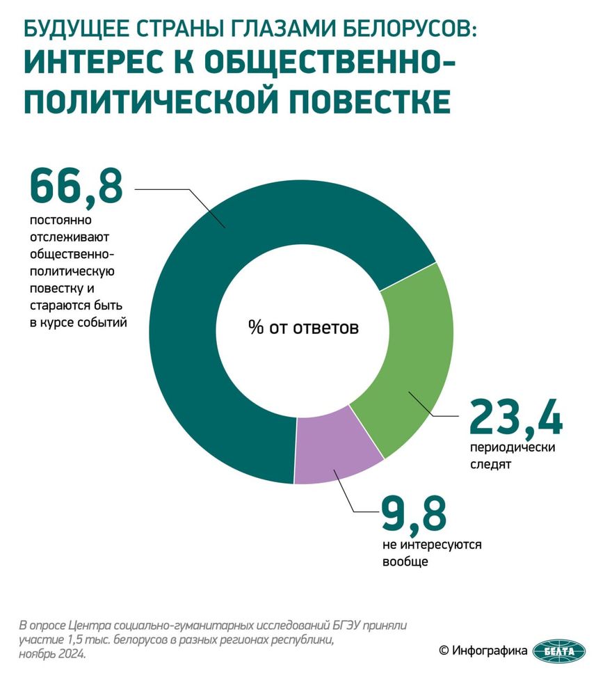 Так, согласно опросу, 66,8% респондентов постоянно отслеживают общественно-политическую повестку и стараются быть в курсе событий. 23,4% – периодически, 9,8% – не интересуются вообще.