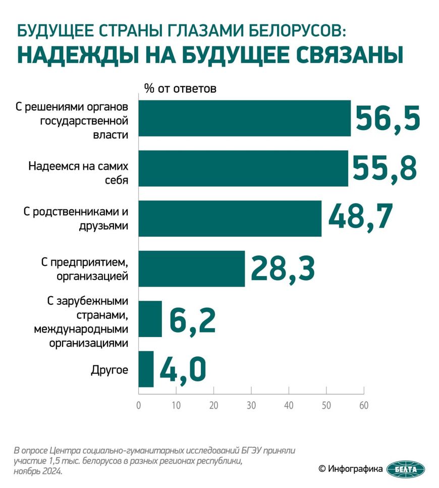 Надежды на будущее 56,5% белорусов связывают с решениями органов государственной власти, 55,8% надеются на самих себя, 48,7% связывают с родственниками и друзьями, 28,3% – с предприятием, организацией, 6,2% – с зарубежными странами, международными организациями.