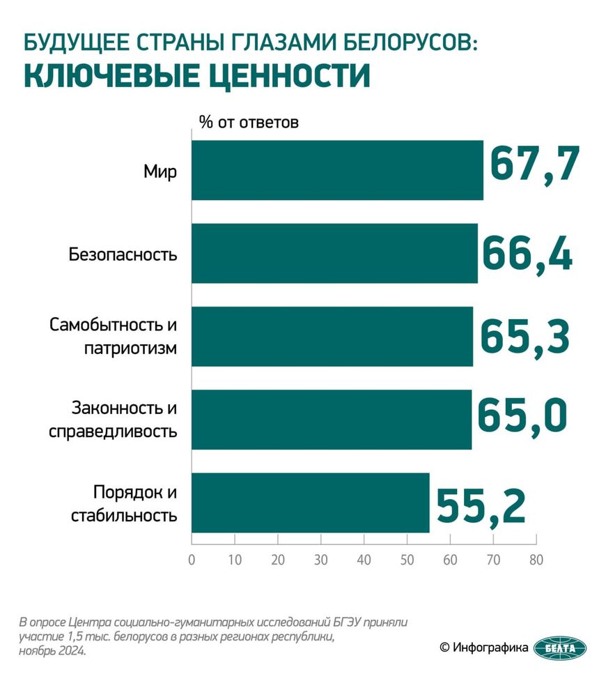 Белорусам также предлагалось назвать ключевые ценности. Мир назвали 67,7% опрошенных, безопасность – 66,4%, самобытность и патриотизм – 65,3%.