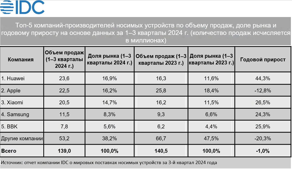 В отчете IDC отмечается, что несмотря на снижение количества продаж умных часов и браслетов в 2024 году, наблюдаемое среди компаний по всему миру, годовой рост темпа продаж китайских производителей составил 20,1%.