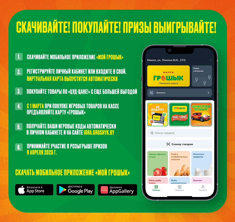 Скорее скачивайте приложение «Мой Грошык» в App Store, Google Play или App Gallery и получайте массу преимуществ в один клик!