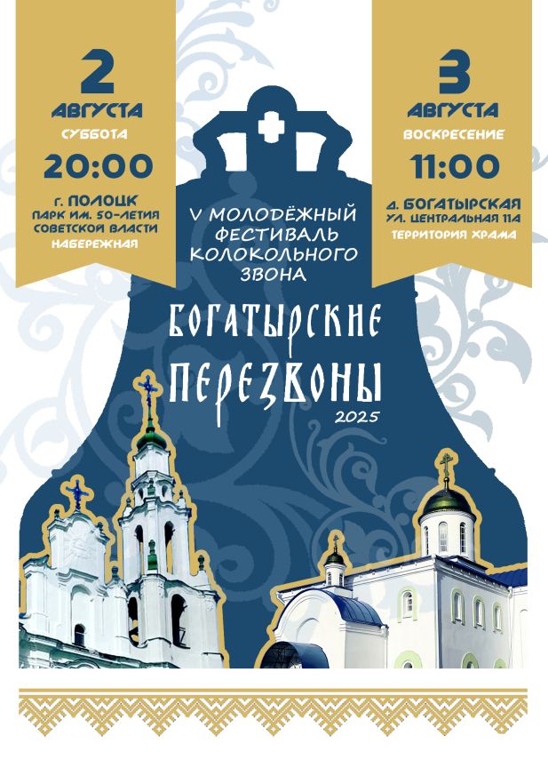 2-3 августа в Приходе храма Рождества Пресвятой Богородицы деревни Богатырская (на окраине Полоцка) пройдет V молодежный фестиваль колокольного звона «БОГАТЫРСКИЕ ПЕРЕЗВОНЫ» – 2025. Приглашаются все желающие.
