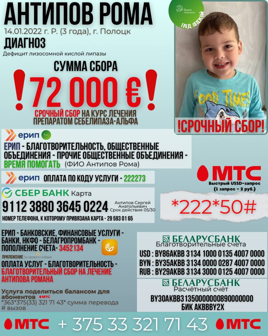 Уважаемые новополочане! У трехлетнего полочанина Ромы Антипова редкое генетическое заболевание – дефицит лизосомной кислой липазы! Открыт сбор средств на сумму 72000€! Родители Романа являются работниками ОАО «Трест №16 г.Новополоцка»