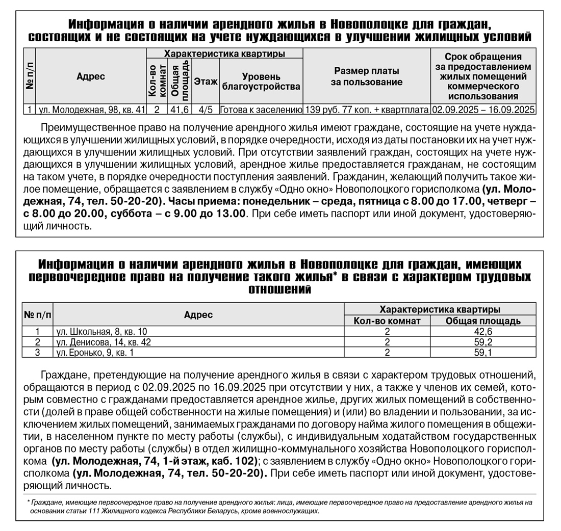 Информация о наличии арендного жилья в Новополоцке регулярно публикуется в газете «Новополоцк сегодня», а также на сайте Новополоцкого городского исполнительного комитета.