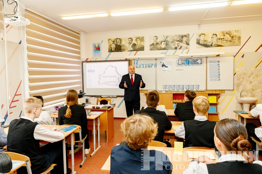 В минувшую среду во всех учреждениях общего среднего образования прошли единые уроки с участием представителей властей и общественных организаций города. Председатель Новополоцкого горисполкома Игорь Бурмистров посетил гимназию № 1.