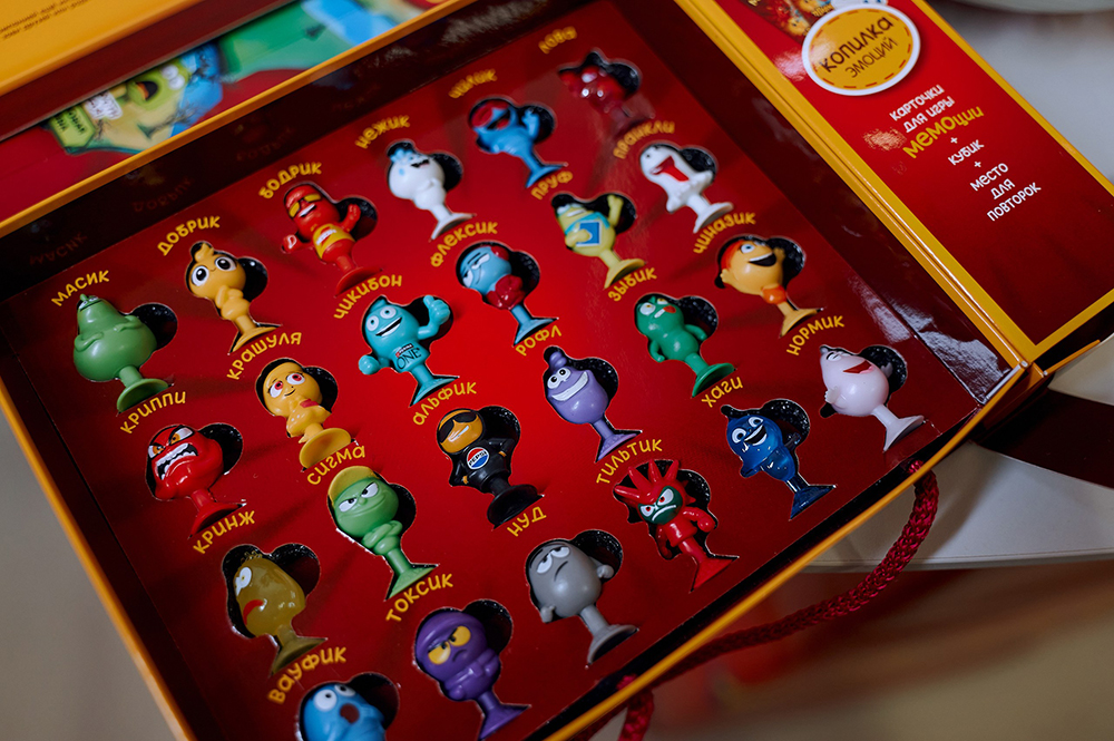 Для хранения коллекции предназначен чемодан эмоций. В него входят альбом с персональными ячейками для персонажей и две настолки – игра-бродилка и «Мемоции». В отличие от «Мемо», в ней нужно не только составлять пары, но и изображать разные эмоции. В игре присутствуют разные сценарии и суперрежимы, в том числе «Карусель», «Папа спит!» и «Молния».