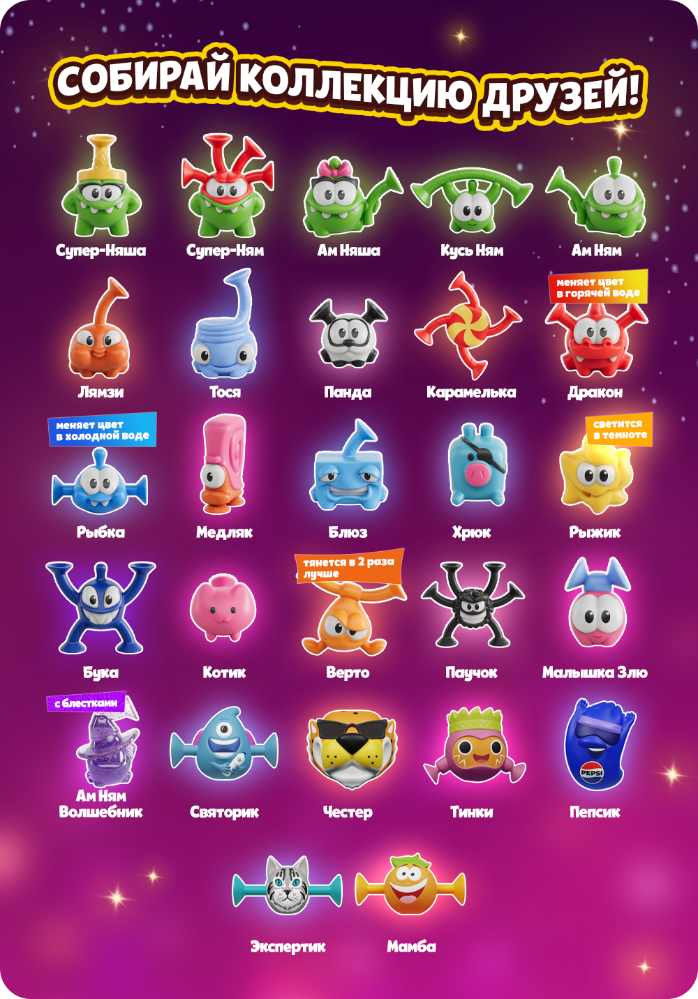 Коллекция «Бонстики и Ам Нямы» состоит из 27 фигурок — персонажей вселенной Ам Няма и друзей Бонстиков. У фигурок есть ручки-липучки: их можно соединять между собой, крепить на карандаши и ручки, украшать комнату или даже новогоднюю ёлку.
