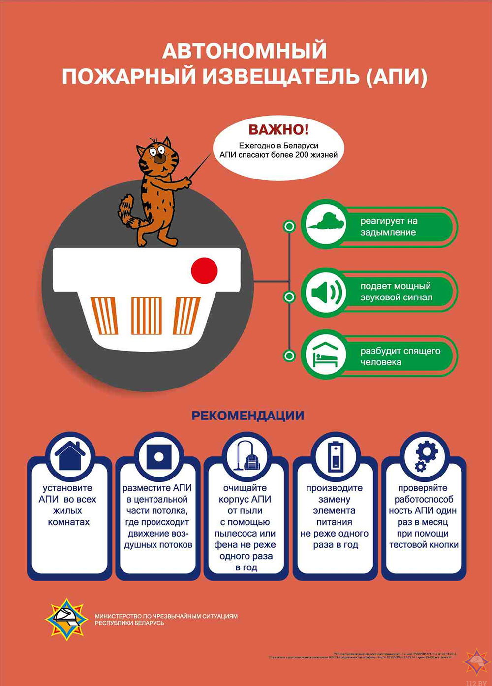 МЧС рекомендует установить автономный пожарный извещатель в каждом жилом помещении. Мигающий сигнал светодиода красного цвета, расположенного на корпусе автономного пожарного извещатель, свидетельствует о его исправности и нахождении в дежурном режиме работы. При обнаружении задымления автономный пожарный извещатель подает прерывистый звуковой сигнал с постоянным свечением светодиода красного цвета. Для прекращения подачи звукового сигнала извещателя нужно устранить источник задымления и проветрить помещение.