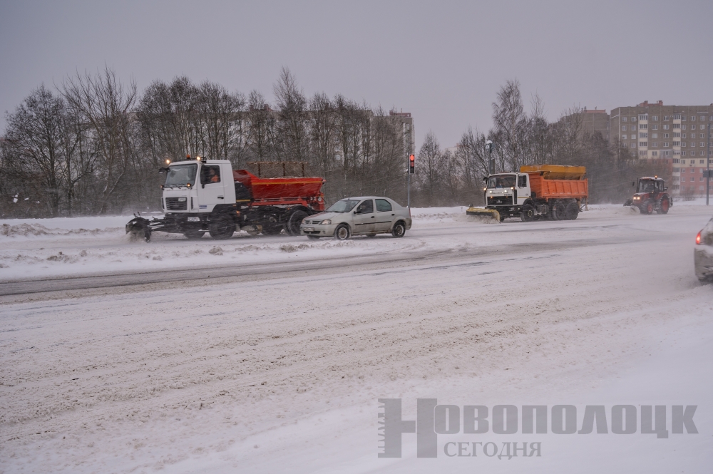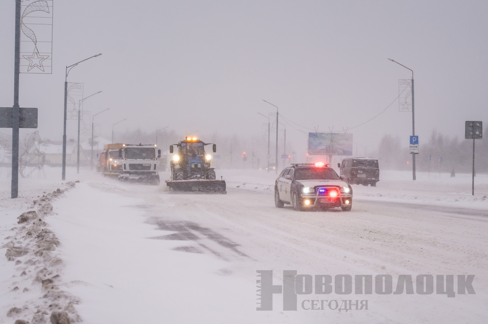 В связи с интенсивным снегопадом коммунальные службы Новополоцка работают в усиленном режиме. В таких сложных погодных условиях колонны снегоуборочной техники сопровождают экипажи Госавтоинспекции Новополоцкого ГОВД.