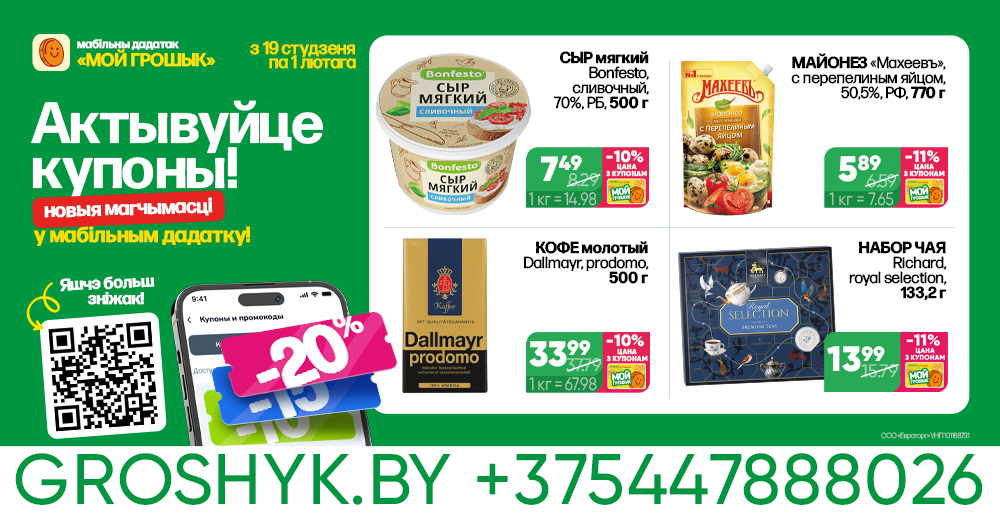 Теперь, с 19 января по 1 февраля, используя мобильное приложение «МОЙ ГРОШЫК», покупатели могут наслаждаться новыми эксклюзивными предложениями! Среди товаров, которые можно купить по специальной цене, — сыр мягкий, рыба и морепродукты, макароны, соленья, чай и кофе, шоколад, а также хозяйственные принадлежности.
