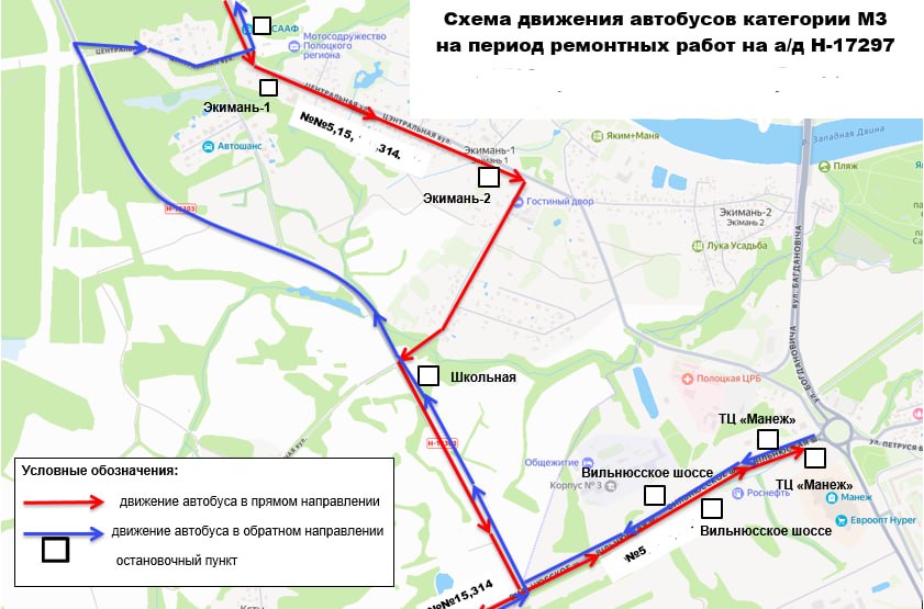 В направлении г.Новополоцка из г.Полоцка движение будет осуществляться с кольцевой развязки по а/д Р45 (Вильнюсское шоссе) на а/д Н-16303 («хлебозаводская)» с выездом на а/д Н17297 через ул.Центральную д.Экимань.