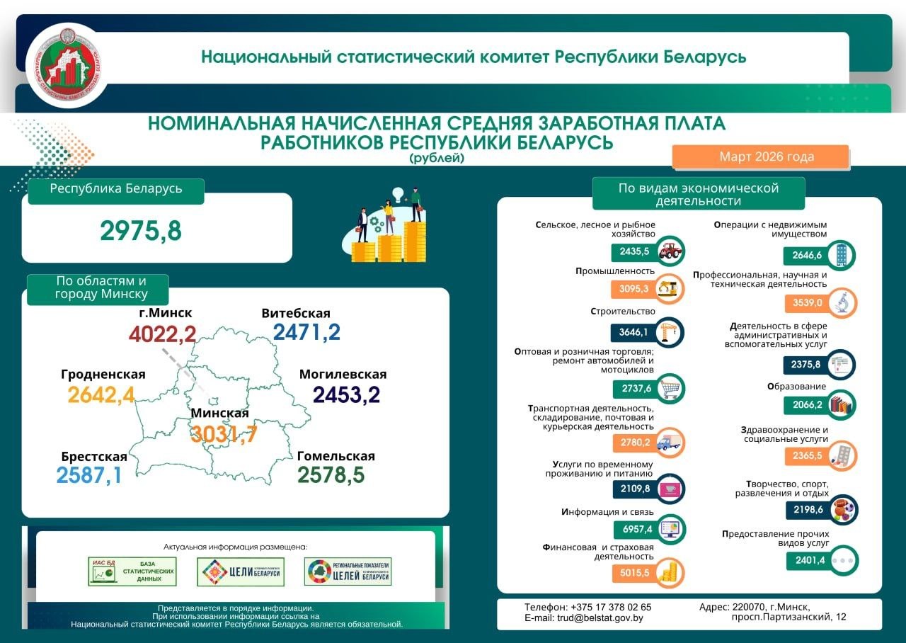 В Беларуси средняя заработная плата в марте 2026 года составила 2975,8 белорусских рублей