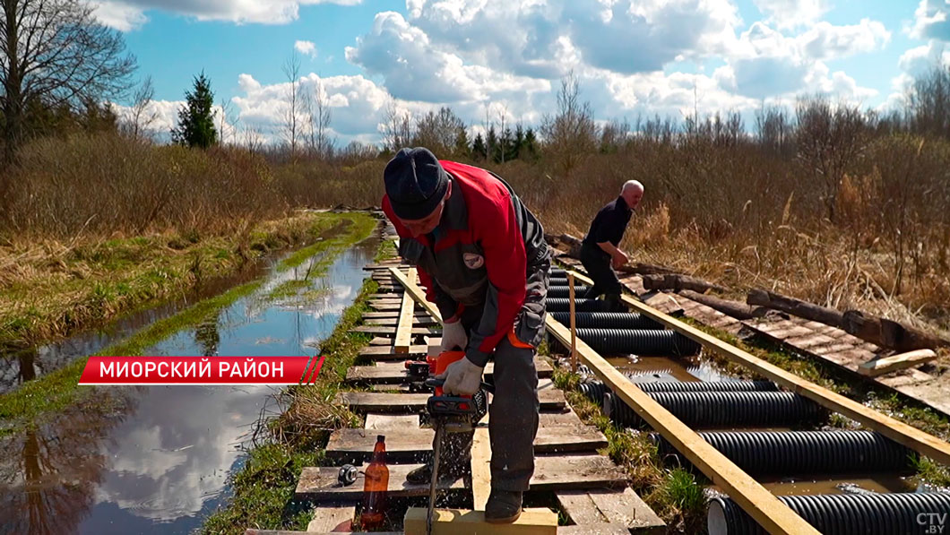 Работы идут на маршруте в Миорском районе. Двухкилометровая экотропа пролегает по верховому болоту и славится самым широким в Европе деревянным настилом. Со временем основание пришло в негодность – его заменят на двух участках: на подходе к тропе и на лесной территории. Это сделает отдых на природе комфортнее.